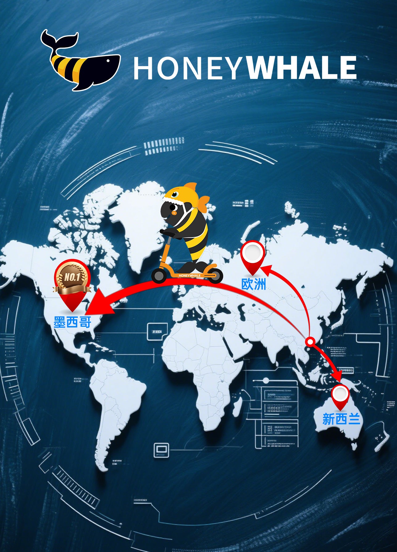 "Honey"象征我们对用户体验如蜂蜜般细腻的追求,"Whale"则彰显产品如深海巨鲸般强悍的续航动力。无论是城市街道还是崎岖小路,都能陪伴用户畅快前行,探索未知。目前HONEYWHALE已成为拉美电动滑板车行业的领军品牌,连续数年蝉联销量冠军。线上覆盖Amazon、Mercado Libre等12个电商平台,线下30家以上品牌门店进驻墨西哥城、瓜达拉哈拉等核心商圈,成为当地用户首选的出行品牌。如今,HONEYWHALE的足迹已遍布墨西哥、欧洲、新西兰等多个国家和地区,以卓越的产品品质和贴心的服务,赢得了全球用户的广泛认可与信赖。
